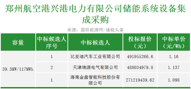 第一中标候选人为比亚迪汽车工业有限公司,投标总报价为135720000.00元,投标单价1.16元/Wh;第二中标候选人为天津瑞源电气有限公司,投标总报价为133042100.00元,投标单价1.137元/Wh;第三中标候选人为海南金盘智能科技股份有限公司,投标总报价为128466000.00元,投标单价1.098元/Wh。