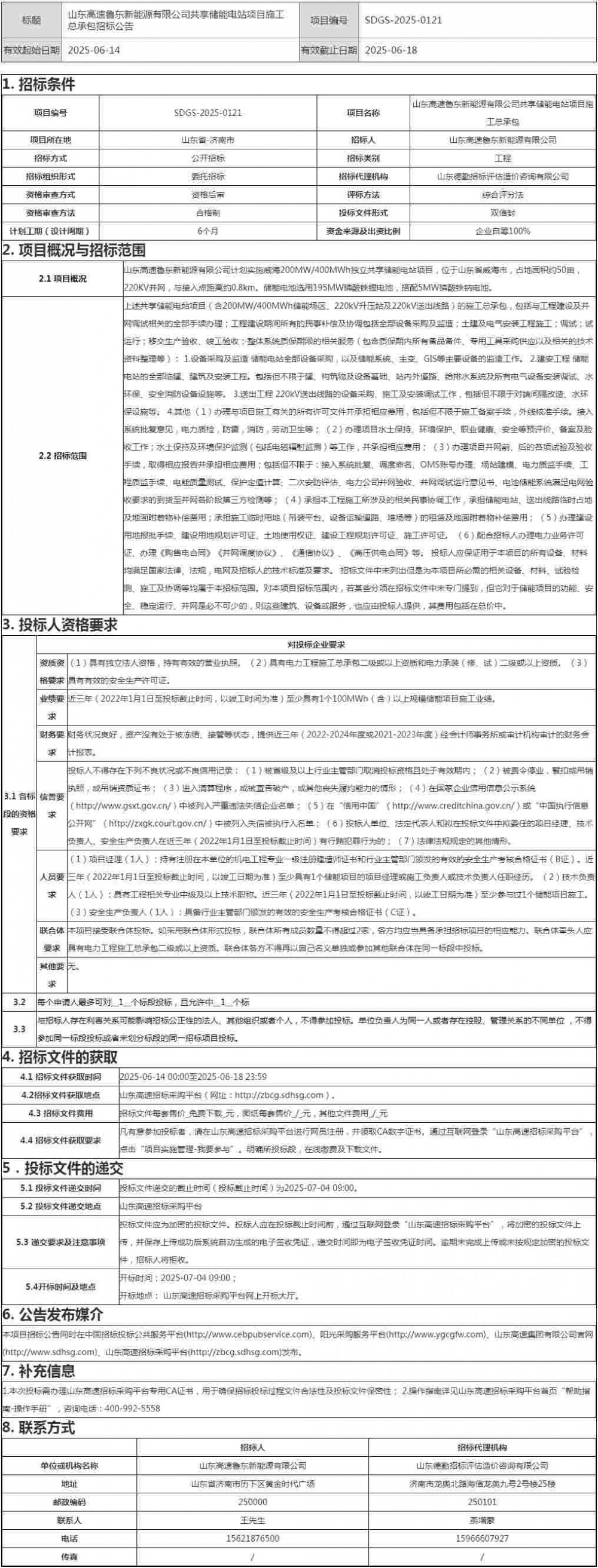 6月14日,山东高速鲁东新能源有限公司共享储能电站项目施工总承包招标公告发布。