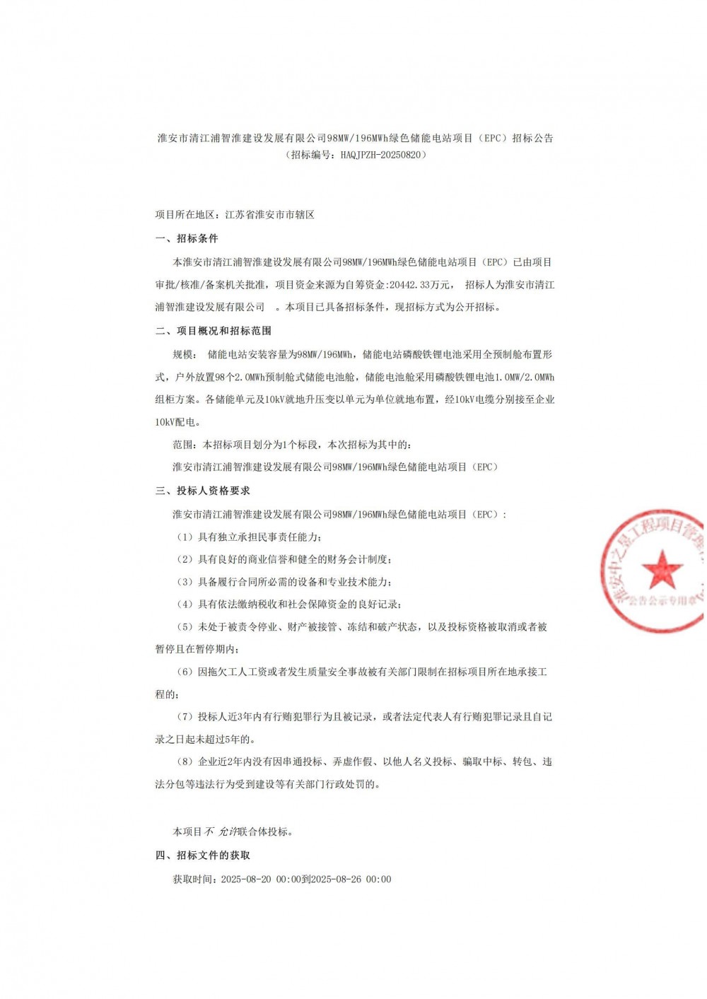 8月20日,淮安市清江浦智淮建设发展有限公司98MW/196MWh绿色储能电站项目(EPC)招标公告发布。