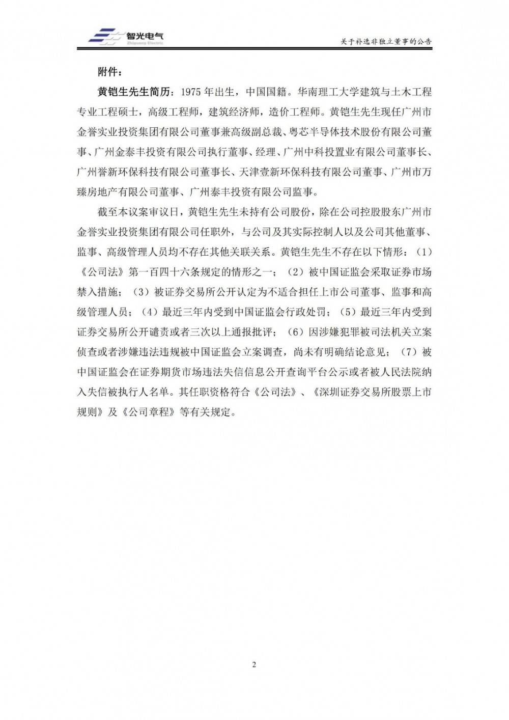 9月15日,智光电气发布公告称,公司召开第七届董事会第六次会议,审议通过了《关于补选公司董事的议案》,具体情况如下:
