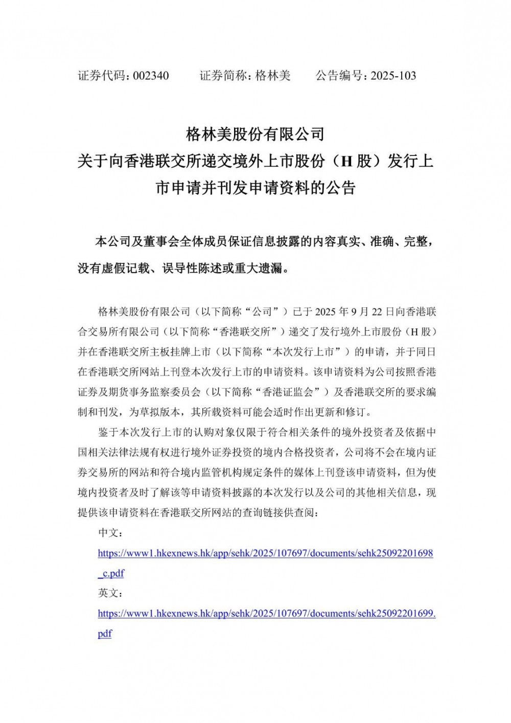 9月23日,格林美公告,公司已于2025年9月22日向香港联合交易所有限公司递交了发行境外上市股份(H股)并在香港联交所主板挂牌上市的申请,并于同日在香港联交所网站上刊登本次发行上市的申请资料。