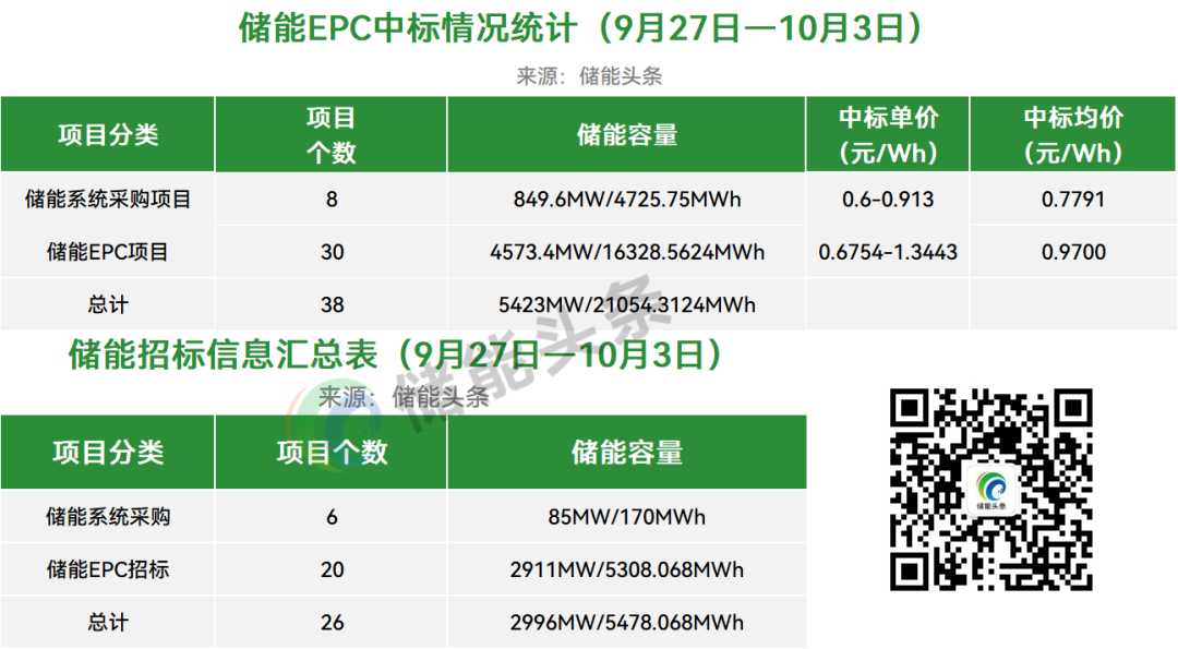 据储能头条对本周(9月27日-10月3日)储能系统与EPC招中标公开项目进行统计与分析。
