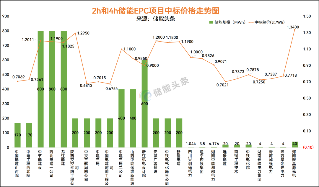 最低价为中国电建集团河南工程有限公司在中广核新能源四川泸州古蔺100MW200MWh储能项目EPC总承包工程中报出, 单价0.6754元/Wh。